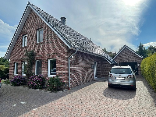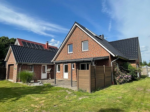 Dieses junge Dreigiebelhaus mit Garage aus dem Jahr 2012 befindet sich in absolut ruhiger Sackgassenendlage im beliebten Ortsteil Moormerland-Veenhusen. Am Ende der Straße gelegen bietet das Grundstück mit 765 m² viel Privatsphäre und direkten Zugang von der Rückseite des Gartens zu einem nahegelegenen Badesee.