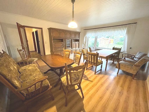 Der Bungalow überzeugt durch eine praktische und gut durchdachte Raumaufteilung. Sie betreten das Haus und finden sich in einer großzügigen Diele wieder, die als zentraler Raum des Hauses fungiert und Zugang zu den weiteren Bereichen bietet. Die Küche ist geräumig. Das große Wohnzimmer ist lichtdurchflutet und bildet das Herzstück des Hauses. Mit direktem Zugang zum sonnigen Garten können Sie hier entspannte Stunden verbringen und die Natur genießen. Im Erdgeschoss finden Sie außerdem ein Schlafzimmer, ein weiteres Zimmer, das Badezimmer sowie ein Gäste-WC.