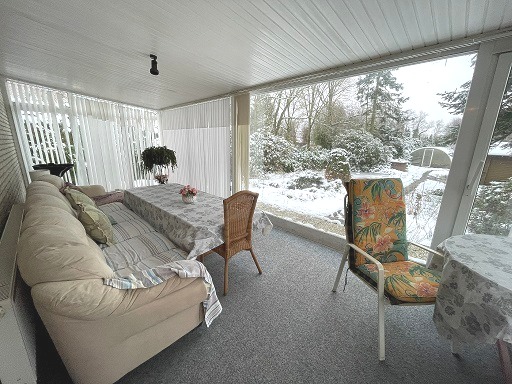 Ein besonderes Highlight ist der große Wintergarten, der einen wunderbaren Blick in den Garten bietet und zu jeder Jahreszeit ein angenehmer Aufenthaltsort ist. Von hier aus gelangt man direkt in den Garten mit Südausrichtung, der liebevoll gestaltet ist und im Sommer eine wahre Wohlfühloase darstellt.