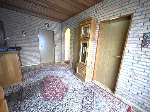 Über den Eingangsbereich (Diele) gelangt man in den großzügigen Wohnbereich, der mit einem Parkettboden ausgestattet ist und über einen Kaminanschluss verfügt. Große Fenster sorgen hier für viel Tageslicht und einen angenehmen Wohnkomfort. Angrenzend liegt die Küche, die ausreichend Platz für eine gemütliche Essecke bietet. Von der Küche aus gelangt man in den praktischen Hauswirtschaftsraum, der zusätzlichen Stauraum und über einen 2. Eingang verfügt.
