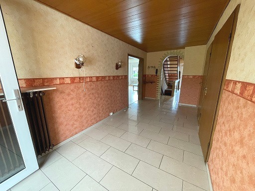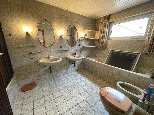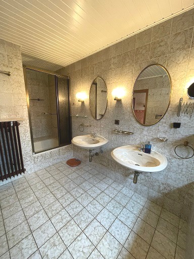 Ebenfalls im Erdgeschoss liegen ein Gäste-WC sowie ein großes Badezimmer mit Wanne, Dusche, Bidet, zwei Waschbecken und separatem WC. Das Erdgeschoß ist durch den zentralen Flur erschlossen, von dem aus alle Räume direkt zugänglich sind.