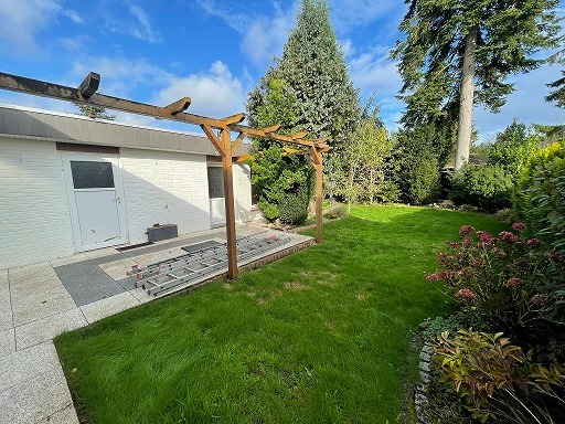 Der große Garten ist das besondere Highlight dieser Immobilie. Mit seiner gepflegten Rasenfläche, einer Terrasse und einem Blockhaus im hinteren Bereich bietet er vielfältige Nutzungsmöglichkeiten – ob als Ruheoase, Spielparadies oder für gesellige Stunden. Das Blockhaus wird derzeit als Partyhütte genutzt; daneben befindet sich ein Holzlager für den Kamin.